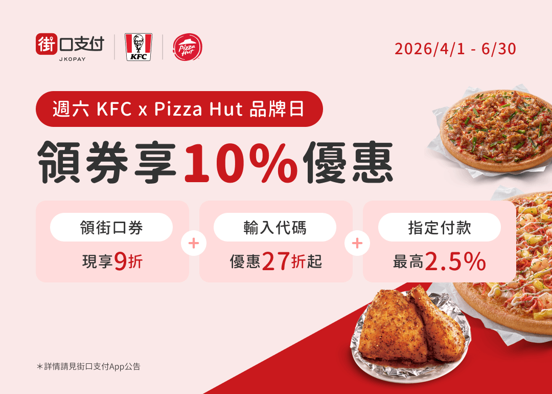 先領取當月「肯德基品牌券」及「必勝客品牌券」並於每週六至「線上訂購 或 全臺適用店家」消費使用街口支付,不限金額皆可折抵(每券每週限折抵1次,先折先贏)。
