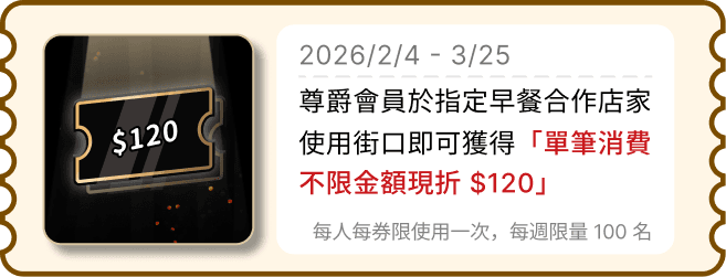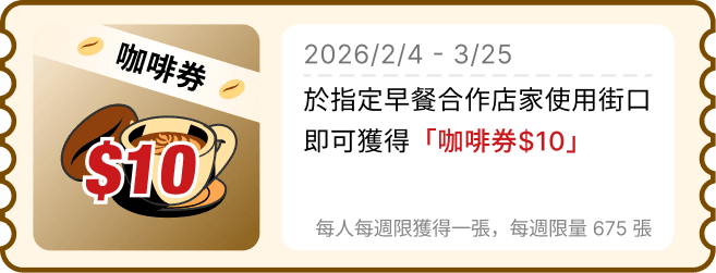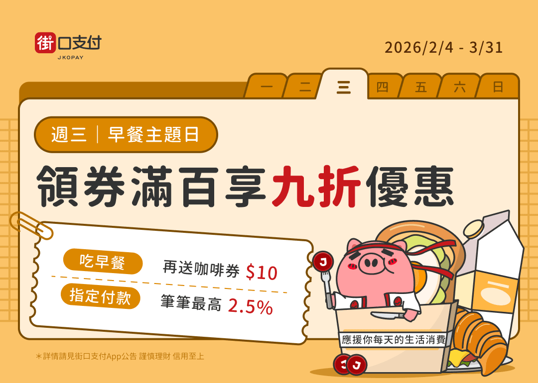 於街口支付 App 活動頁領取「週三早餐券」,並於 2026/2/4-3/25 每周三 至「指定早餐合作店家」使用街口支付付款,單筆消費滿 $100 現折 $10。(每週限量 1,875 名,每人每券限使用一次,先折先贏)